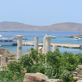 After sleeping in, we enjoyed spanakopita, fresh fruit, and rich espresso while overlooking turquoise waters. Our excursion to the island of Delos started with a late morning transfer to New Port via Sea Bus (no 40-minute walk for us this time!). Once there, we caught another boat to Delos, where we trekked in the boiling sun for a tour of the ruins and mythological birthplace of Apollo.